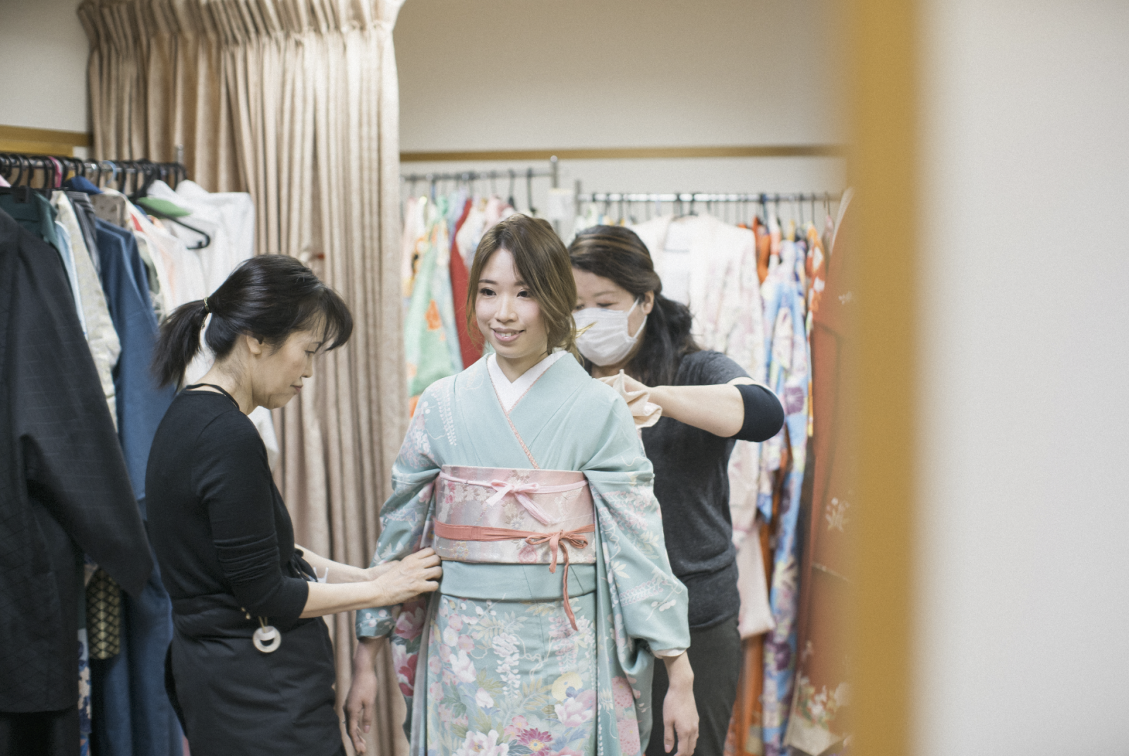 在京都,大部分的和服租借店主要針對遊客,選衣間裡常常有多對新人在挑選和服,因此優質款式常常被搶先選走。有時候由於時間限制,可能選不到心儀的款式,只好妥協。我們合作的和服店則主要服務本地居民進行成人禮或婚禮。他們提供的款式和質料都是上乘之選,並且採用預約制度。每個時段只服務一對新人,避免了與他人爭搶款式的情況。這樣的安排確保和服老師不必同時應對大量即時到店的遊客,不僅可供應更多款式選擇,也保證客人擁有滿意的穿著體驗。